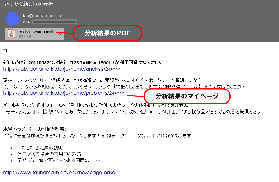 Fauna Marinでの分析が完了すると登録したメールアドレスに分析結果をお知らせするメールが届きます。分析結果を確認する方法はメールに貼付されているPDFとメールのURLからFauna MarinのWebサイトのマイページで確認する方法です。 PDFでは各分析値の数値が記載されていますが、マイページではより詳細をご確認いただけます。