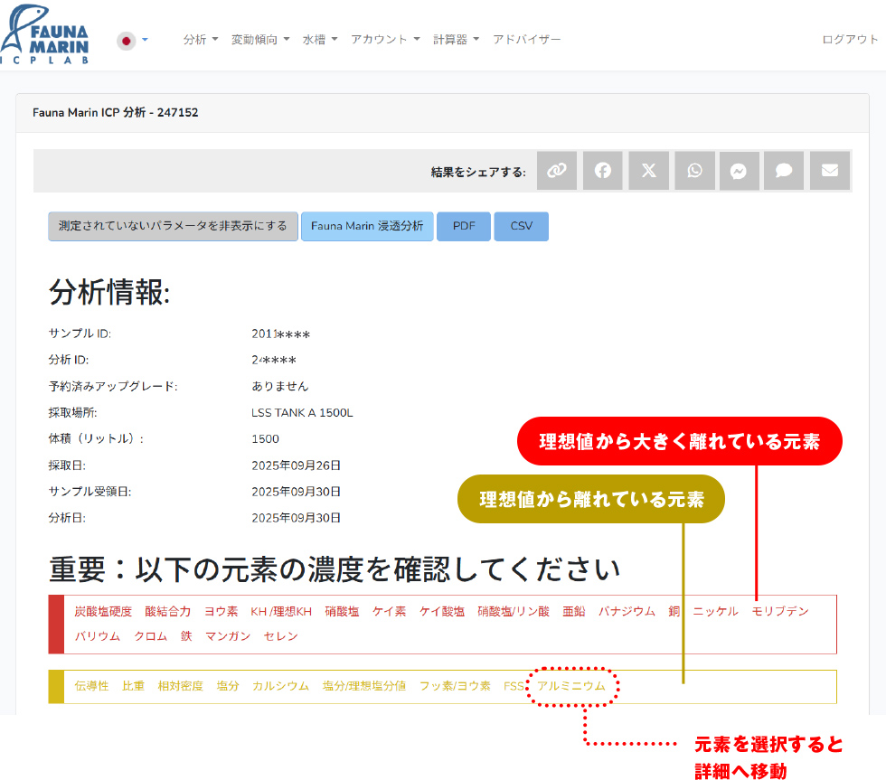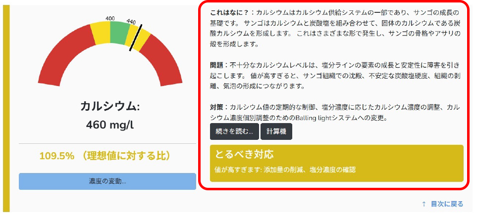 詳細には各元素がどのような役割、理想値でない場合の問題、取るべき対応が表示されています。 「続きを読む」を選択するとFauna MarinのWebサイトへ移動し、元素のさらに詳細を確認できます。(英語表示のみ)