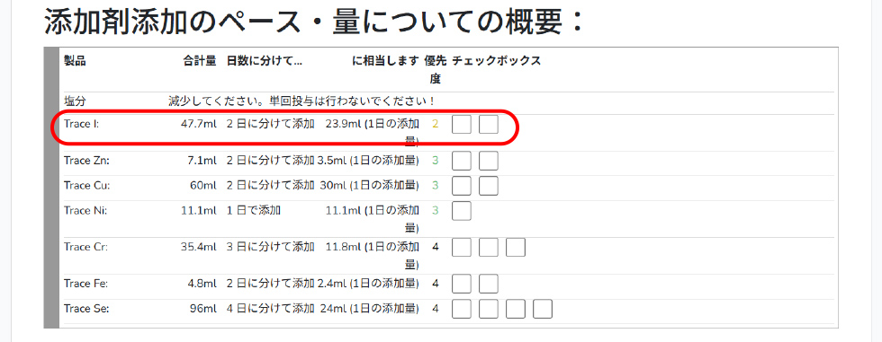 「添加剤のペース・量についての概要:」は理想値範囲外の元素を理想値範囲内にするためにFauna Marinの添加剤の種類と添加量が優先度を分けて表示されています。 例えば下図の場合優先度2のFauna Marinの「Elementals Trace I」を2日に分けて合計47.7ml添加する対応が必要です