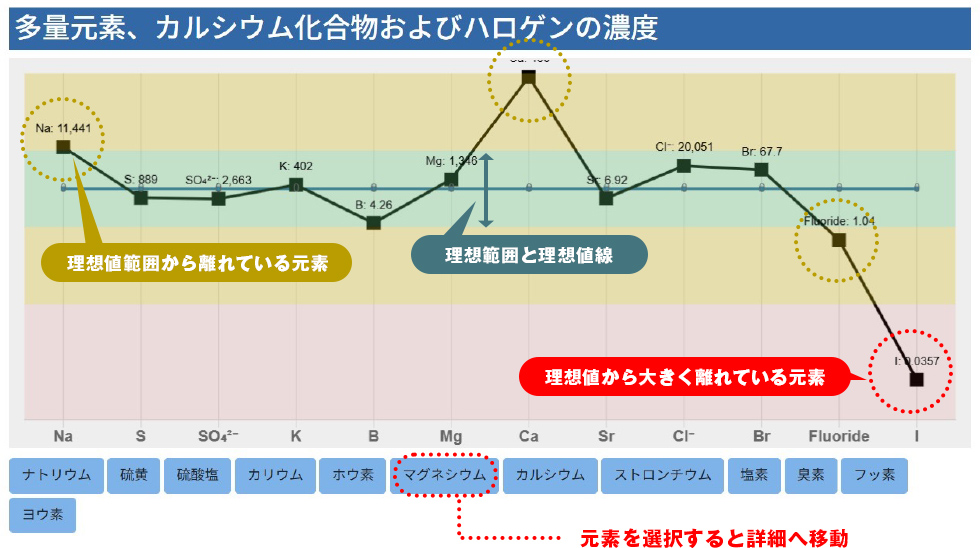大きく元素をグループに分けて理想値の範囲内にあるかをグラフで色分けされて分かりやすく表示されています。グリーンの範囲が理想値範囲内で、中央のグリーンの線は理想値です。 下記サンプルではナトリウムとカルシウム、フッ素が理想値の範囲外にあり、ヨウ素は理想値に対して大きく離れていることを意味します。