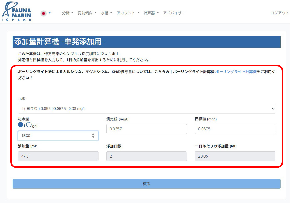 計算機を選択すると、測定値の元素を理想値にするために必要な添加量と日数を表示します。 目標値はなどの情報は変更し、その情報に対する添加量を確認することもできます。