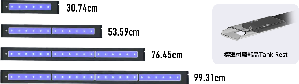 標準付属品のTankRest を使用することで約22cm 幅が増幅し水槽に設置できます。 ( 装着時の幅については事項のPrice エリアにてご確認ください)