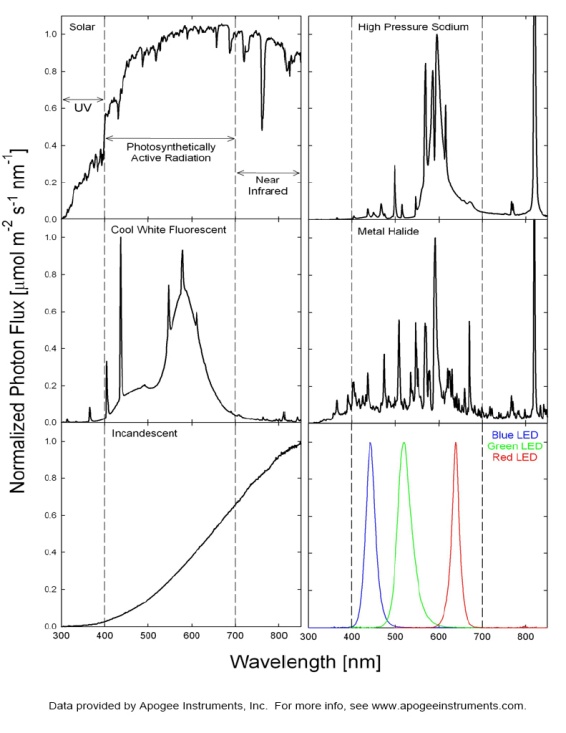 Apogee offers quantum sensors that are calibrated for either sunlight or electric light. The reason for this is due to the significant differences in spectral output among light sources. The following graphs illustrate those differences.