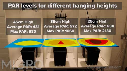 In a recent experiment, MIGRO demonstrated how the hanging height of a grow light affects PAR and growth. In the experiment, grow lights were setup at different heights in three grow spaces. Below is a video of the experiment setup.