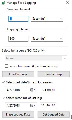 In order to measure the amount of light plants would receive, we employed a SQ-520 full-spectrum quantum sensor with an AL-100 leveling plate from Apogee Instruments and provided power with a Voltaic V44 battery. Prior to the experiment, we logged onto the ApogeeConnect software and setup the following parameters in the sampling and logging intervals and then hit "save settings."