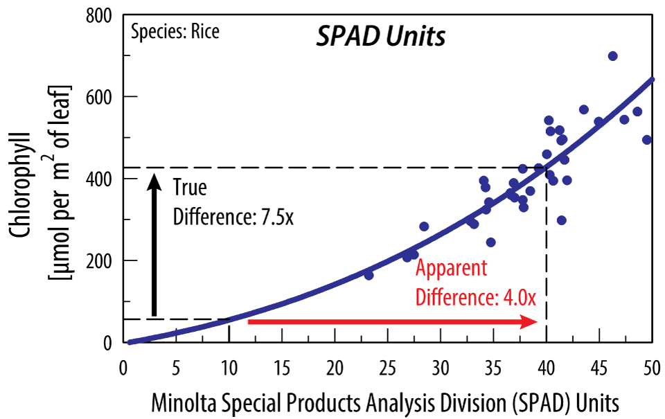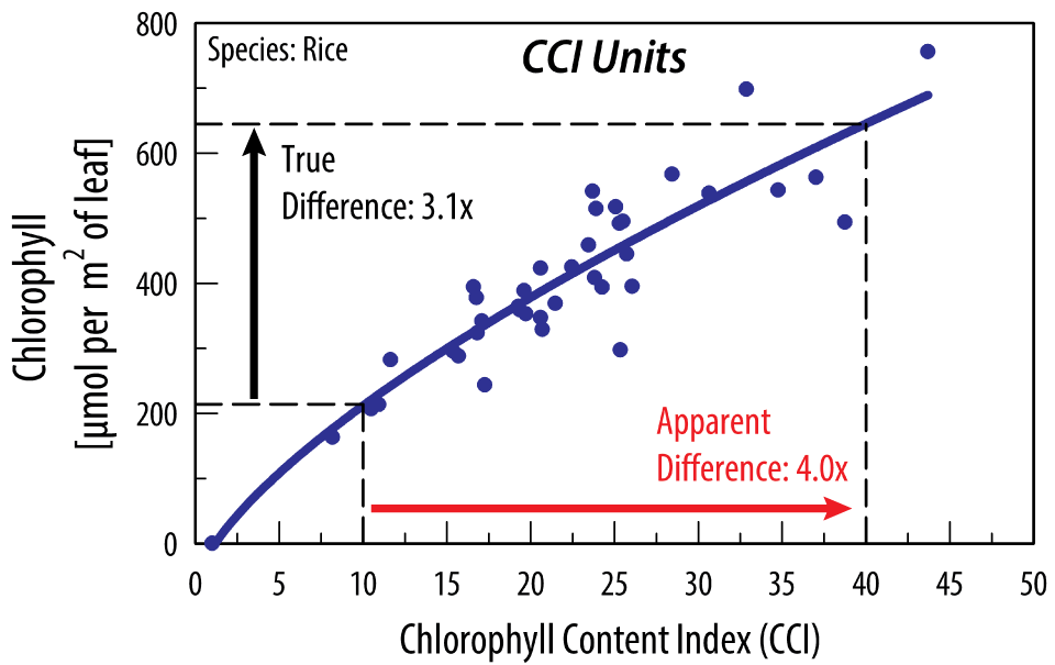 Many hand-held chlorophyll meters used by researchers output a relative index that is non-linearly related to chlorophyll content; Chlorophyll Content Index (CCI) and Special Products Analysis Division (SPAD) are two common indices used by these meters. Measurements made using a meter that outputs a relative index are not equal to the actual chlorophyll concentration in a leaf, therefore, doubling the reading displayed on the meter does not equal a doubling of chlorophyll concentration in the leaf. While it is possible to convert the relative indices to chlorophyll concentration using experimentally determined equations for you specific plant species, Apogee’s MC-100 Chlorophyll Concentration Meter measures chlorophyll concentration directly and can also provide readings in both CCI and SPAD index.