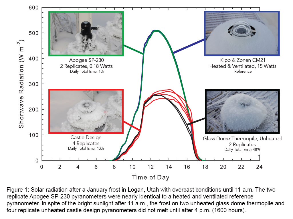 Figure 1: Solar radiation after a January frost in Logan, Utah with overcast conditions until 11 a.m. The two replicate Apogee SP-230 pyranometers were nearly identical to a heated and ventilated reference pyranometer. In spite of the bright sunlight after 11 a.m., the frost on two unheated glass dome thermopile and four replicate unheated castle design pyranometers did not melt until after 4 p.m. (1600 hours).