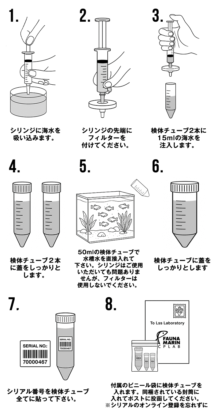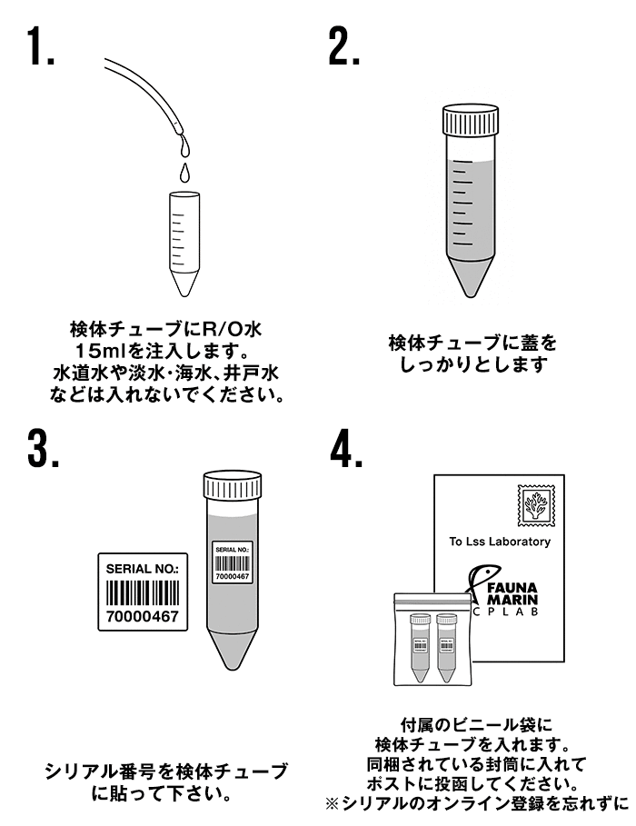 - ・検査数値の誤差、その数値をもとにした水質調整等による生体の死亡やそれに関係する事故・トラブルに対して弊社は保証できません。