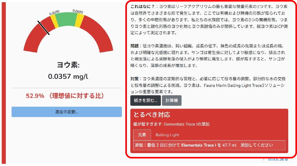 下記の場合、カルシウムは理想値より高いので添加量の削減と塩分濃度の確認の対応をします。ヨウ素は理想値に対して低いのでFauna Marinの「Elementals Trace I」を2日に分けて合計47.7ml添加する対応が必要です。
