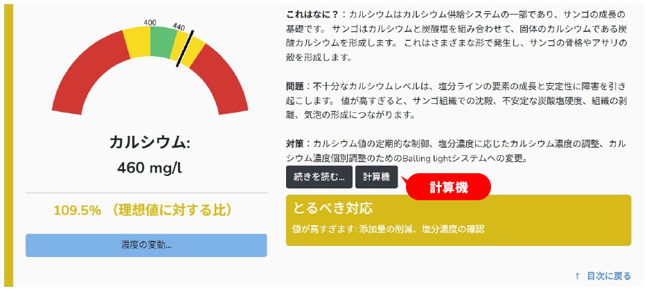 計算機を選択すると、測定値の元素を理想値にするために必要な添加量と日数を表示します。 目標値はなどの情報は変更し、その情報に対する添加量を確認することもできます。