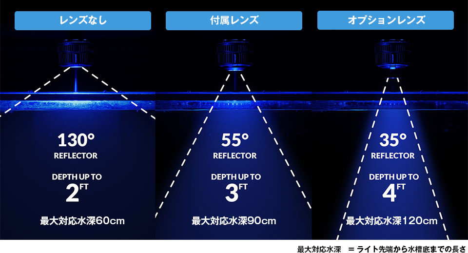 また、レンズ無しでの使用時は最大90cmをカバーできます。必要に応じでレンズの種類とパワー調整を行う事で多くの水槽に対応可能なライトです。
