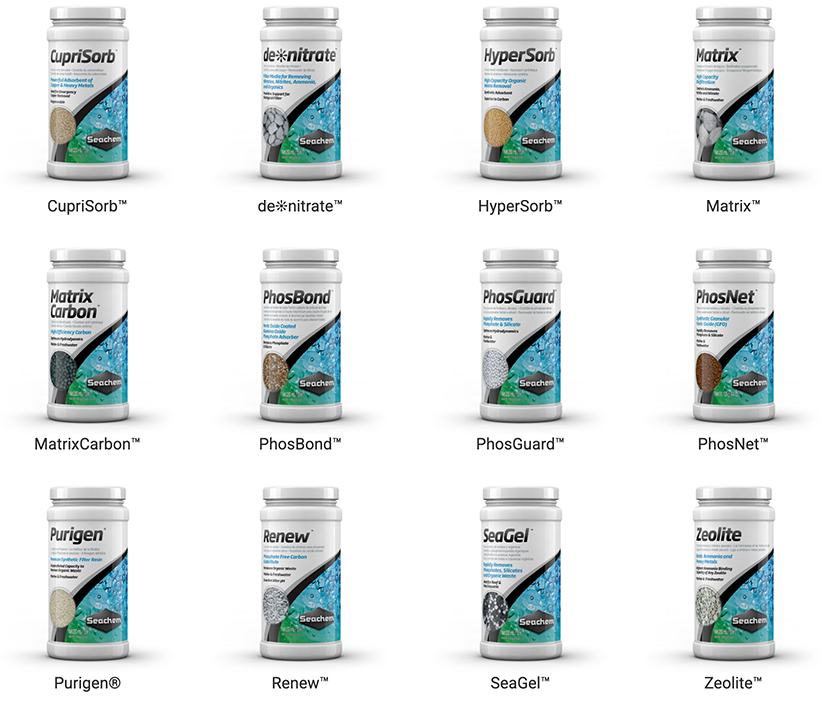 生物濾過材のスペースに他の吸着剤やイオン交換剤等を入れて使用することも可能です。 水槽に必要なメディア量の設置スペースが確保できるかが問題となりますが従来のスポンジフィルターには無かった使用方法が可能です。メディアを入れるネットはお客様がご用意ください。 下記はSeachemのフィルターメディアシリーズです。(近日、日本語ページに更新予定です)