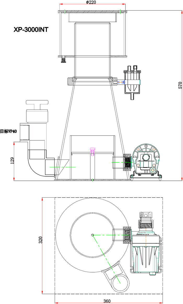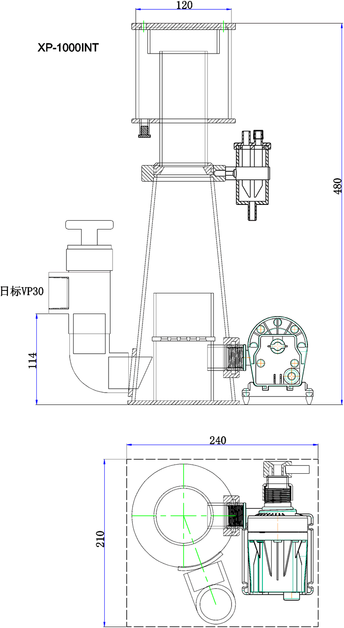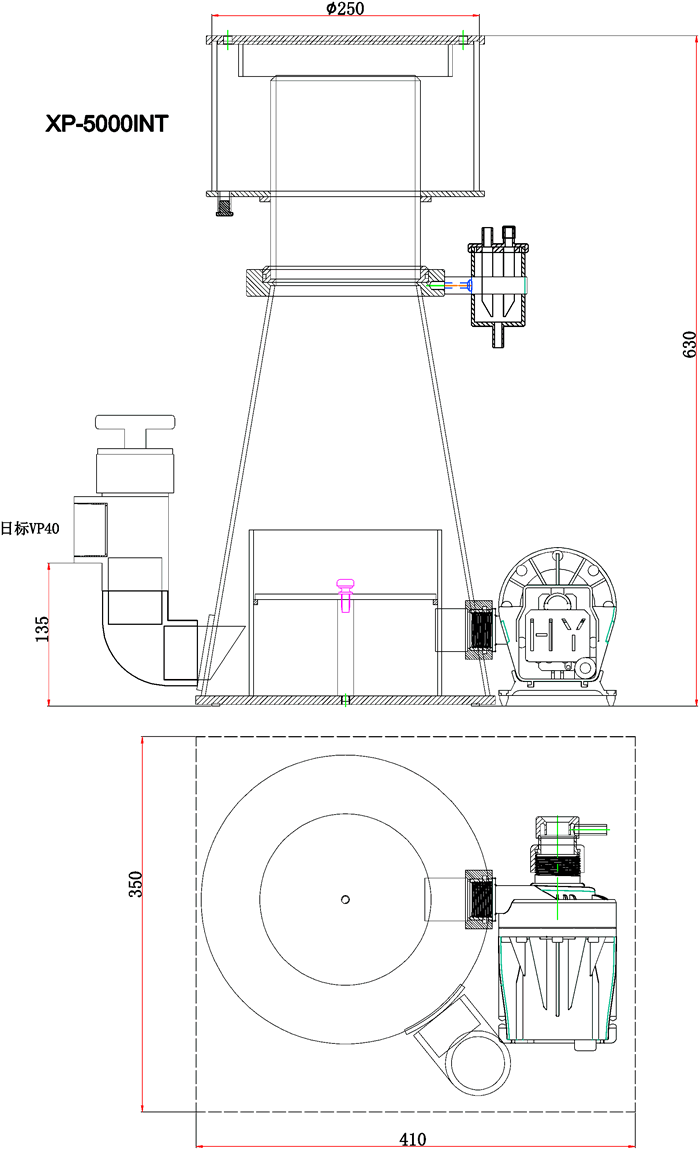 XPシリーズInt(内部式)は、ボディ内での泡の滞留時間を少しでも長くする事を目的にポンプをボディ内に設置せずスキマーボディ外側に設置しました。