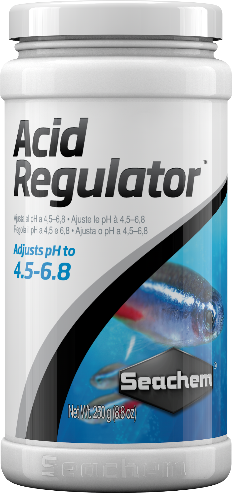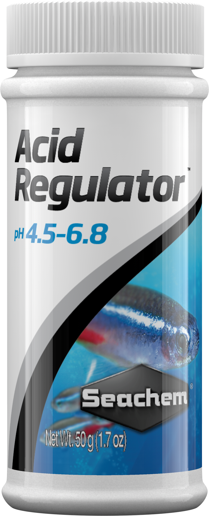 Acid Regulator™ adjusts pH to the acidic range (4.5–5.5) and softens water by precipitating calcium and magnesium. Acid Regulator™ supports the establishment of the optimal environment for all acid acclimated species (e.g. neons and other tetras, etc.). For further freshwater environment enhancement, use Fresh Trace™ to restore the proper level of trace elements and feed NutriDiet® Tropical Flakes for thriving, healthy freshwater community fish.