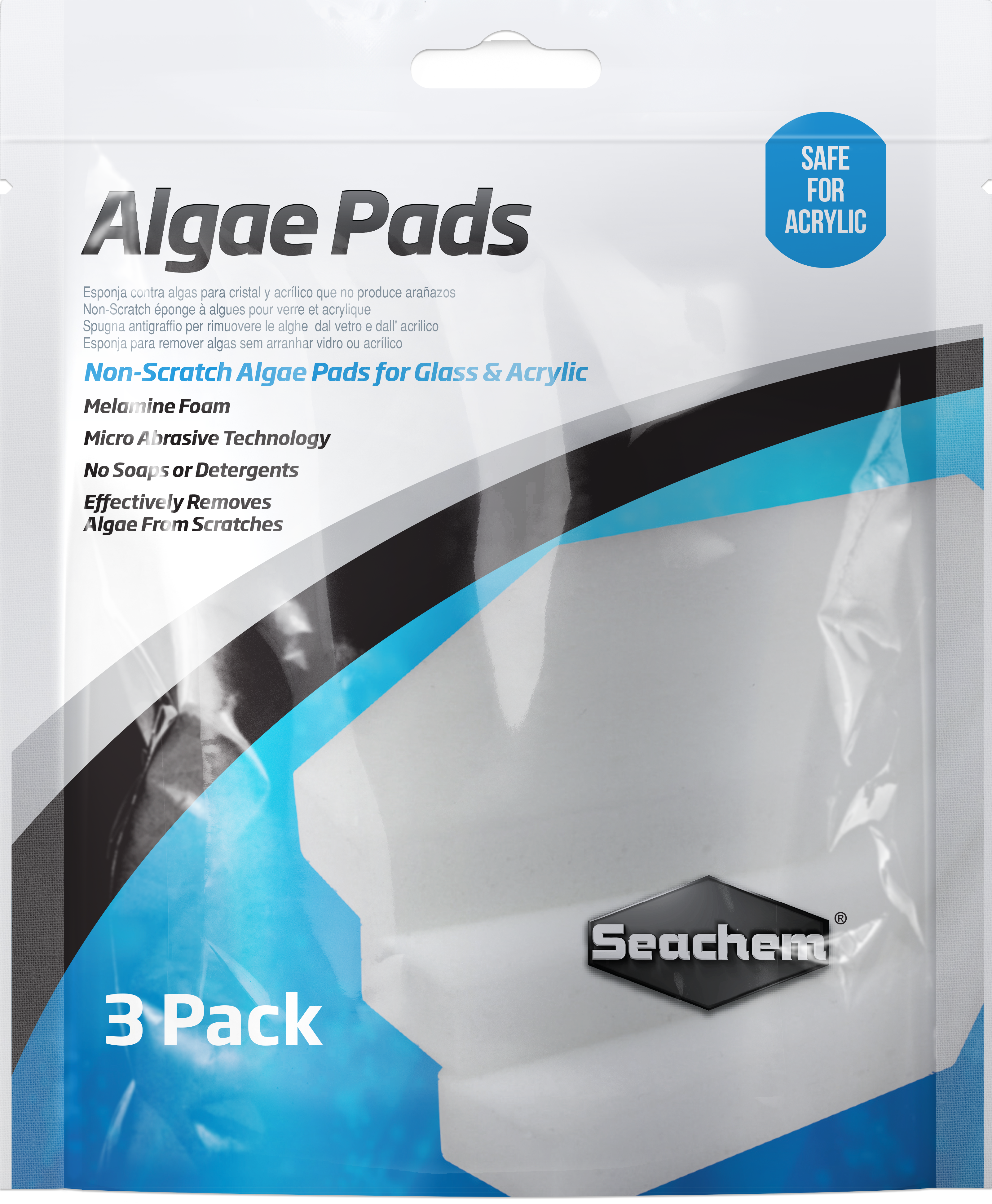 The Seachem Algae Pads are non-scratch algae pads for glass & acrylic. The melamine foam uses micro abrasive technology to easily remove algae from the sides of your aquarium. They are particularly effective at removing algae from scratches. They are chemically inert and do not use soaps or detergents. Their white color contrasts against dark algae making it easier to see when areas are fully clean.
