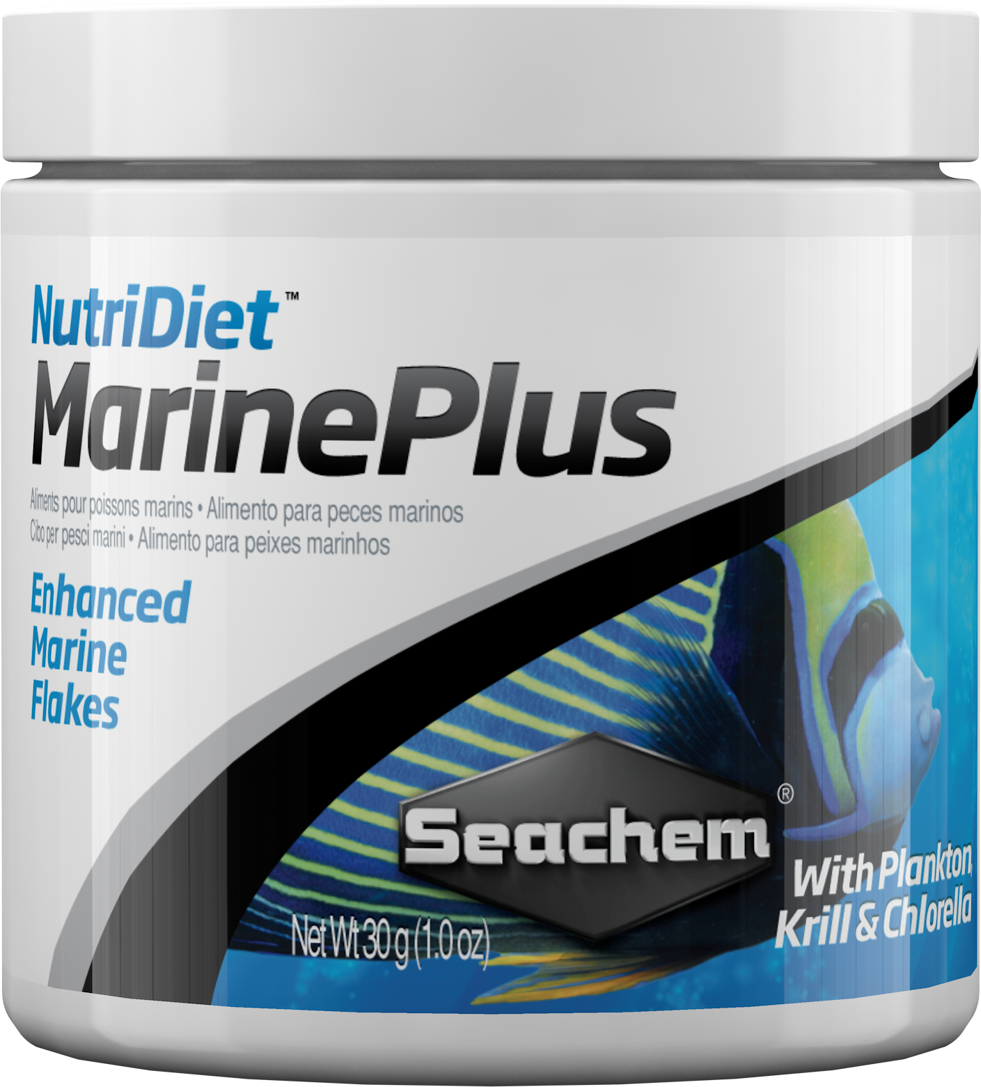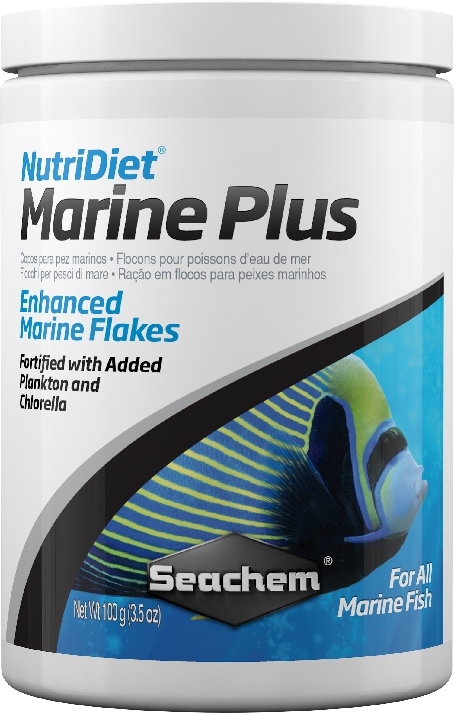NutriDiet® Marine Plus Flakes is a premium and nutritionally balanced diet formulated to meet the requirements of all marine fish. It contains only the highest quality ingredients including fish, plankton, squid, and shrimp. As with all of the Seachem NutriDiets, Marine Plus Flakes have Chlorella Algae as an exceptional source of a broad range of vitamins, amino acids as well as all other nutrients required for animal life. Chlorella Algae is considered a potential super food that far surpasses the nutrients delivered by Spirulina Algae common to other diets. It is enhanced with Entice™ to attract finicky eaters and enhance palatability. Additionally, Marine Plus Flakes contain GarlicGuard™ as an appetite stimulant.