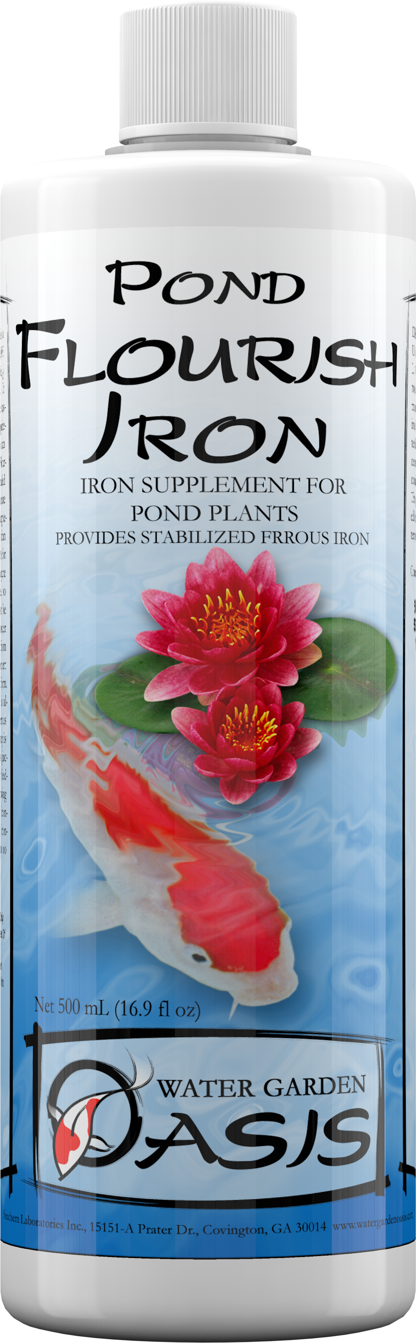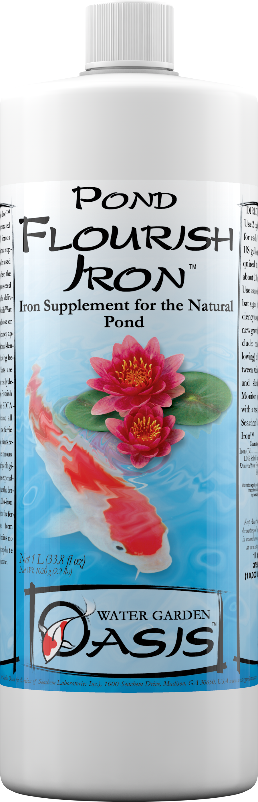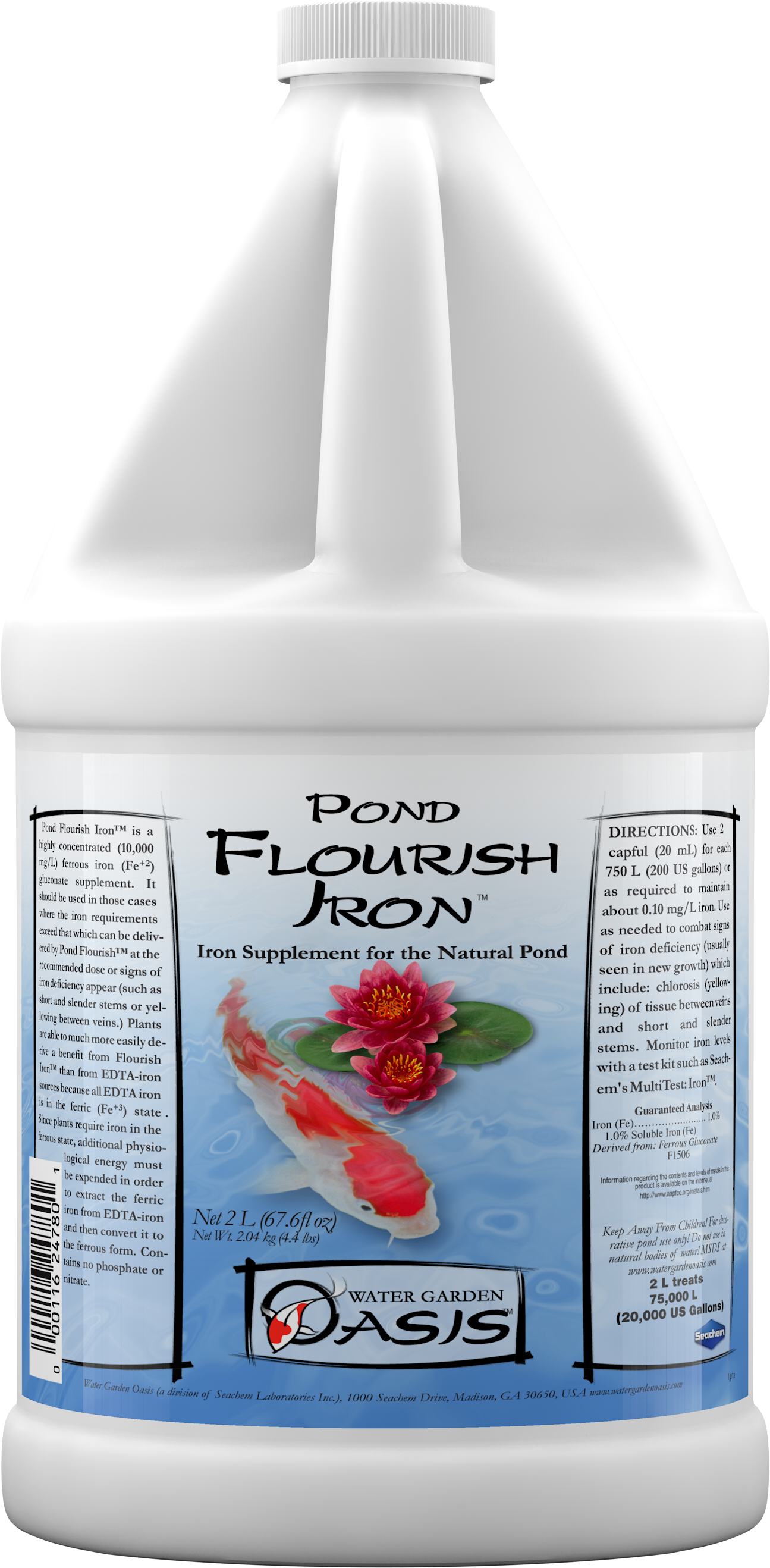 Pond Flourish Iron™ is a highly concentrated (10,000 mg/L) ferrous iron gluconate supplement. Plants are able to much more easily derive a benefit from Pond Flourish Iron™ because ferrous iron gluconate is already in the ferrous form so they do not expend energy reducing it. Despite what other manufacturers may intimate, gluconate is not harmful to plants or fish. In fact, ferrous gluconate is better suited to foliar feeding than is iron-EDTA owing to the relatively weaker iron-gluconate bonding vs. iron-EDTA bonding. In addition, ferrous gluconate has the added bonus of being a source of carbon.