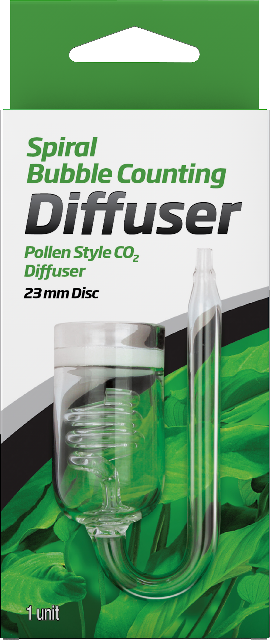 The Spiral Bubble Counting Diffuser is a pollen style CO2 diffuser that connects to CO2 injection systems to easily disperse CO2 gas into the planted aquarium. The built-in spiral bubble counter allows for easy monitoring of the rate of CO2 injection. The inclusion of a bubble counter in the diffuser makes the use of a bubble counter on the CO2 tank or in-line unnecessary. The Spiral Bubble Counting Diffuser has a 30 mm disc.