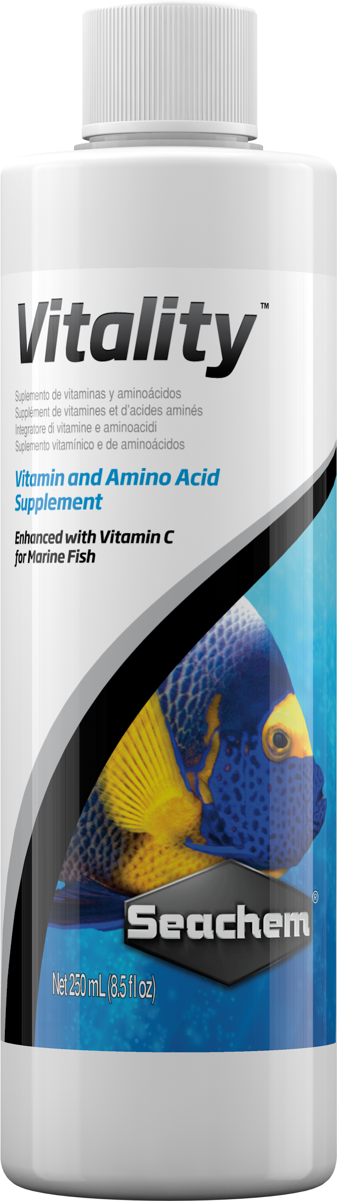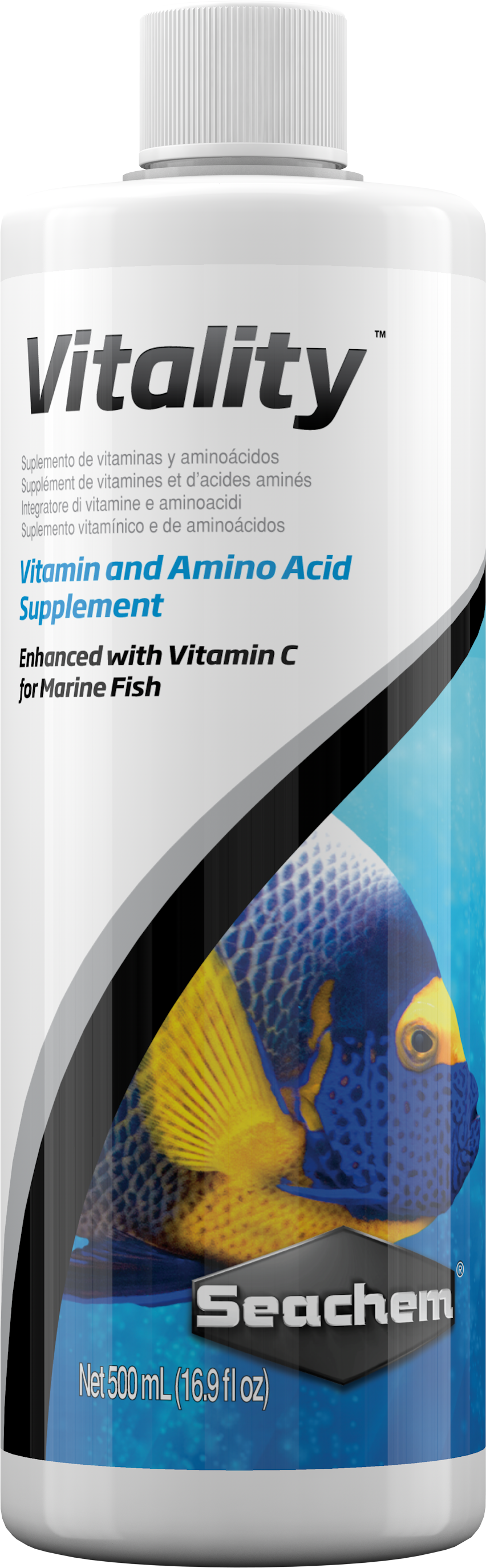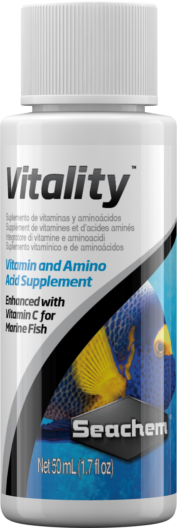Vitality™ is a comprehensive vitamin, amino acid, and trace element supplement developed to address nutritional requirements commonly associated with long term closed system housing of marine ornamental fish. Vitality™ contains ascorbic acid in a heavy base of spirulina and chlorella. Ascorbic acid is a cofactor in the hydroxylation of proline and lysine to components of procollagen, the precursor of collagen, necessary for the formation of connective tissues, scar tissue in wound repair, and bone matrix.* Both spirulina and chlorella contain a rich assortment of amino acids and vitamins. Vitality™ can be used on freshwater ornamental fish; however, it is specifically designed for marine fish.